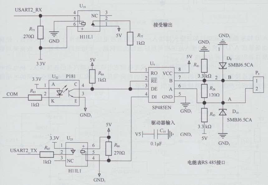 系統共使用四個串行接口,分別與LCD觸摸屏、熱敏打印機、讀卡器和RS?485接口的電能表通信。LCD觸摸屏和熱敏打印機為RS?232電平,經過電平轉換與MCU通信。LCD觸摸屏與MCU的通信協議采用Modbus-RTU通信協議,MCU作為主機,LCD觸摸屏作為從機。熱敏打印機根據打印機模塊提供的協議進行通信。讀卡器為TTL電平,可以直接與MCU相連,采用讀卡器模塊提供的協議進行通信。充電計量的電能表采用多功能單相表,選用2.0等級的電能表,電流規格為5(40)A?。電表提供RS-485接口,通過DL/T?645-2007通信協議與MCU通信。通過讀取電能表的電能值作為充電樁的電能計量值,通過讀取電表電流和電壓值來判斷充電過程中是否出現過流和過壓的情況,并加以處理。RS?485接口原理圖如圖所示。