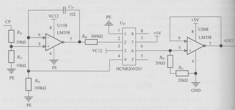 電壓測量首先需要通過測量互感器將電壓和電流轉換為可以測量的小信號。例如對220V的電壓信號的測量,采用的互感器變比為2mA/5mA,采用如圖所示的電路,可知在220V時互感器的輸出恰好為5mA。