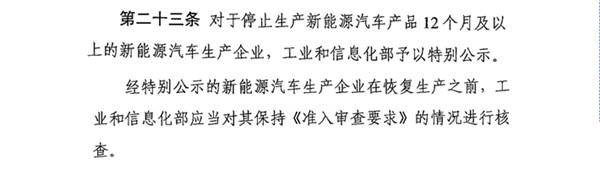 事實上,本次《通知》發布的依據是工信部2017年1月17日發布的《新能源汽車生產企業及產品準入管理規定》。其中,第二十三條明確指出:“對于停止生產新能源汽車產品12個月及以上的新能源汽車生產企業,工業和信息化部予以特別公示。經特別公示的新能源汽車生產企業在恢復生產之前,工業和信息化部應當對其保持《準入審查要求》的情況進行核查。”